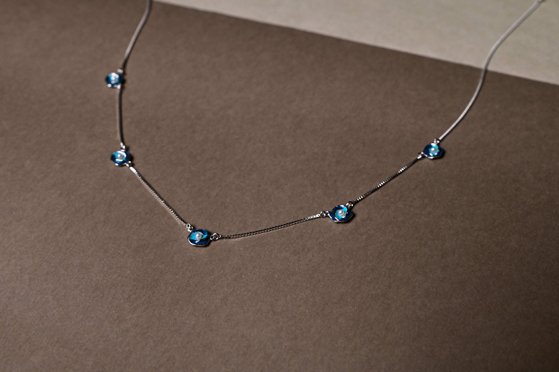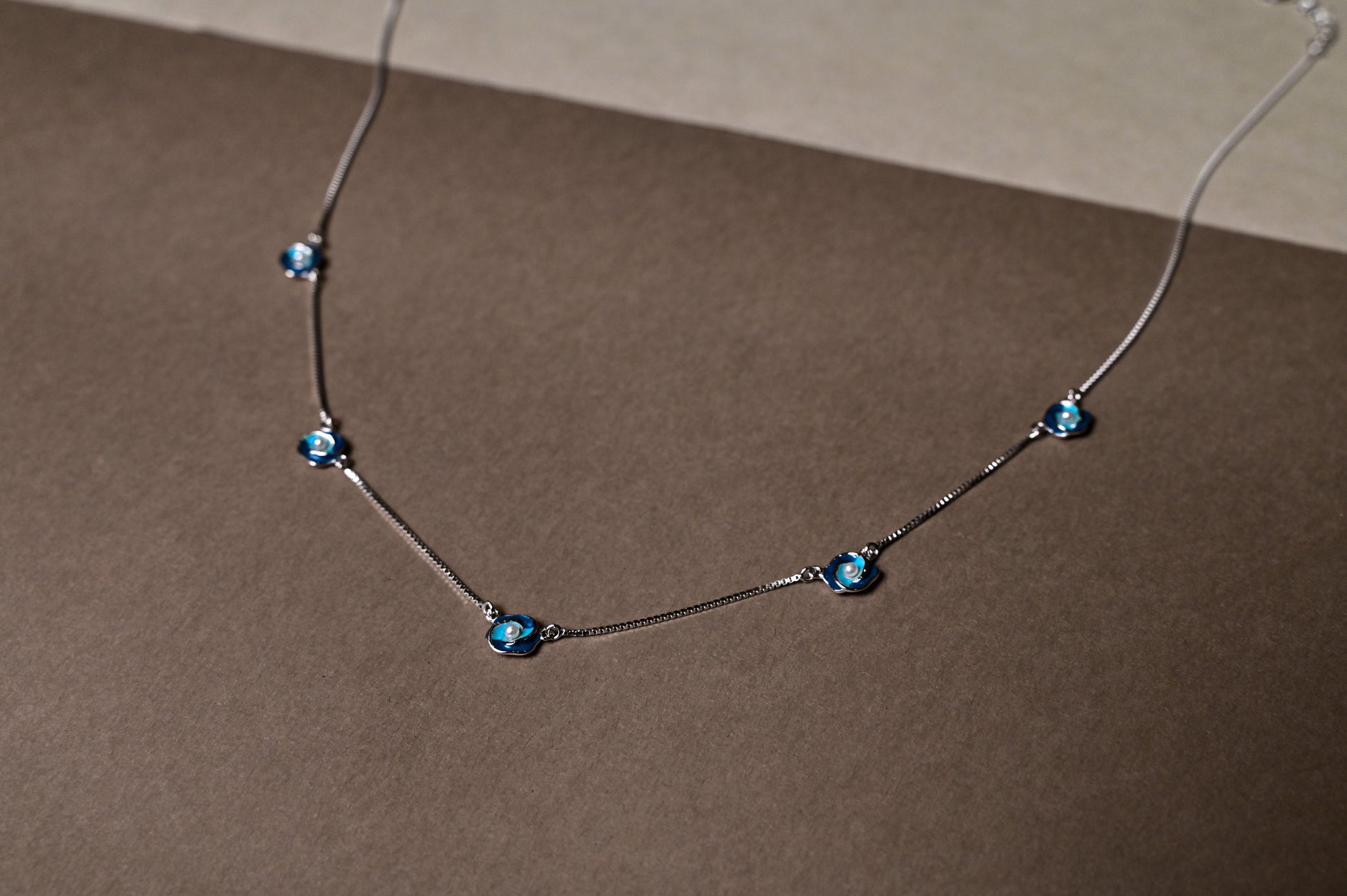 Soft, serene, and beautifully distinctive — the Azure Bloom Necklace adds a refreshing pop of colour to your jewellery collection. Crafted along a sleek silver-toned chain, this necklace features delicately spaced floral motifs, each adorned with a luminous blue enamel petal and a tiny pearl-like centre that adds a touch of elegance.