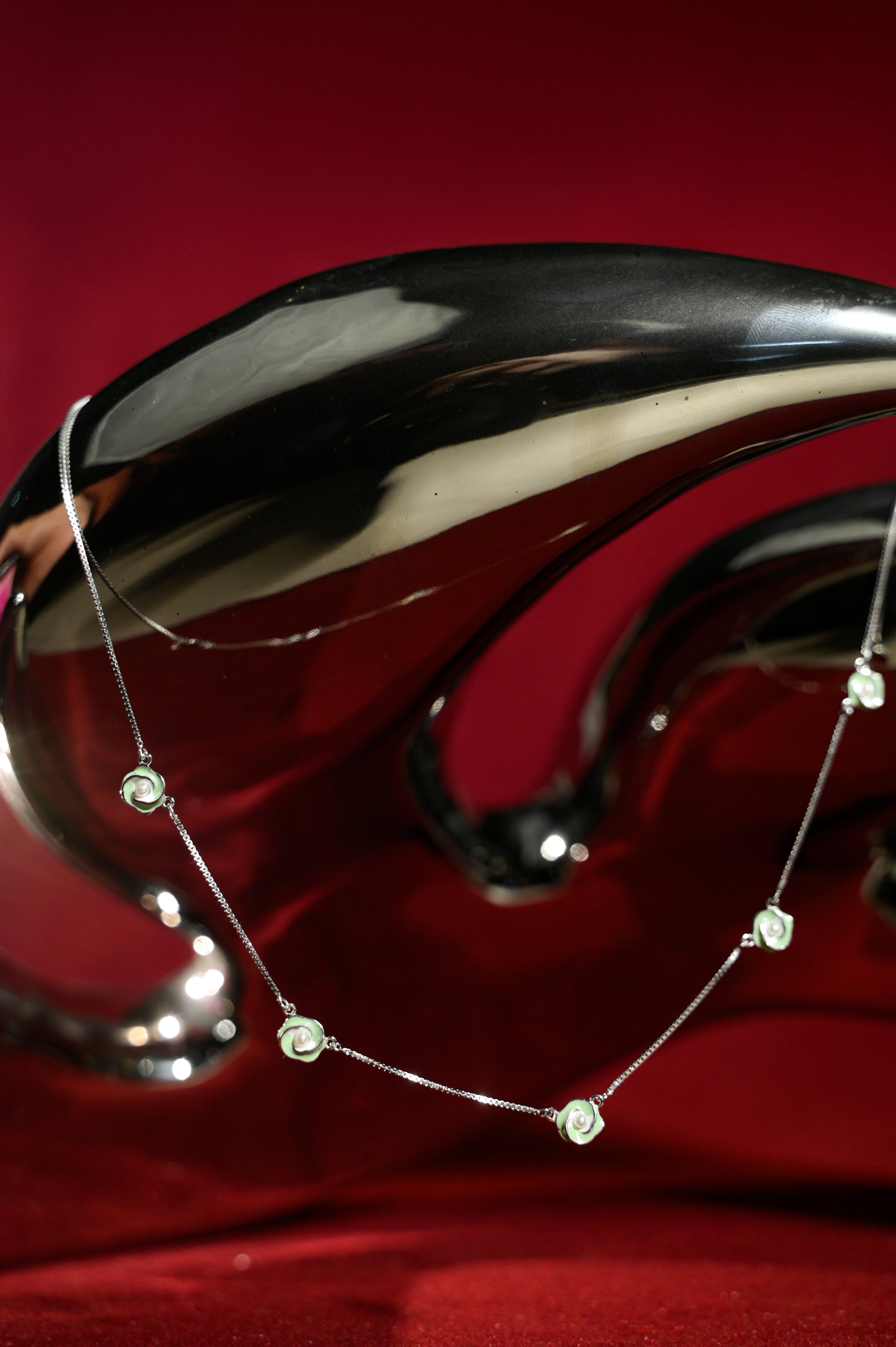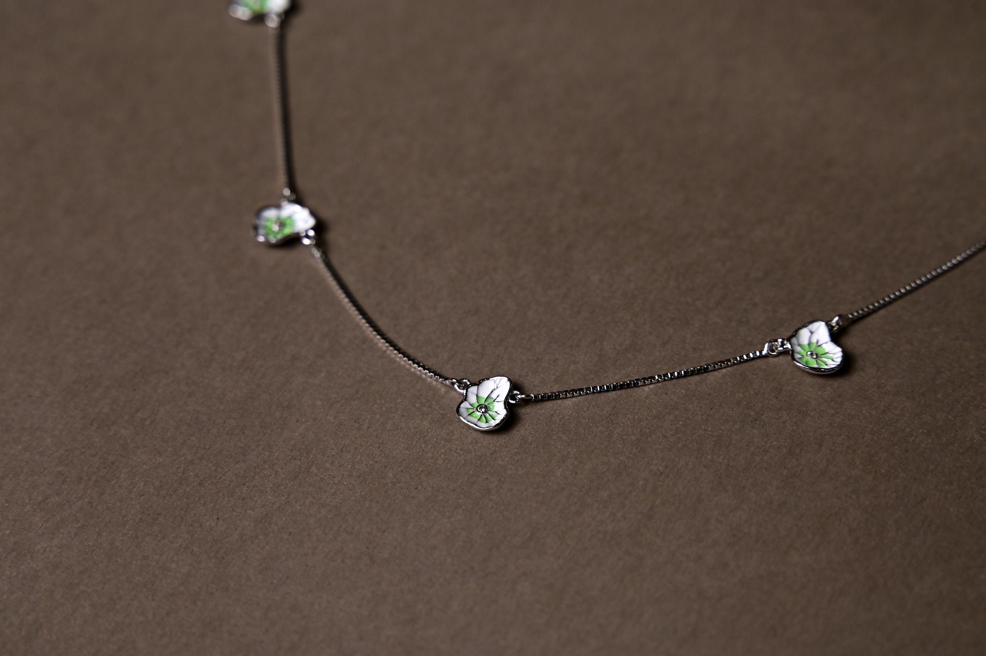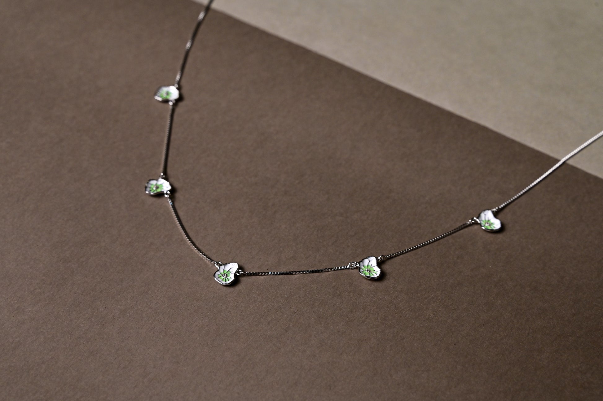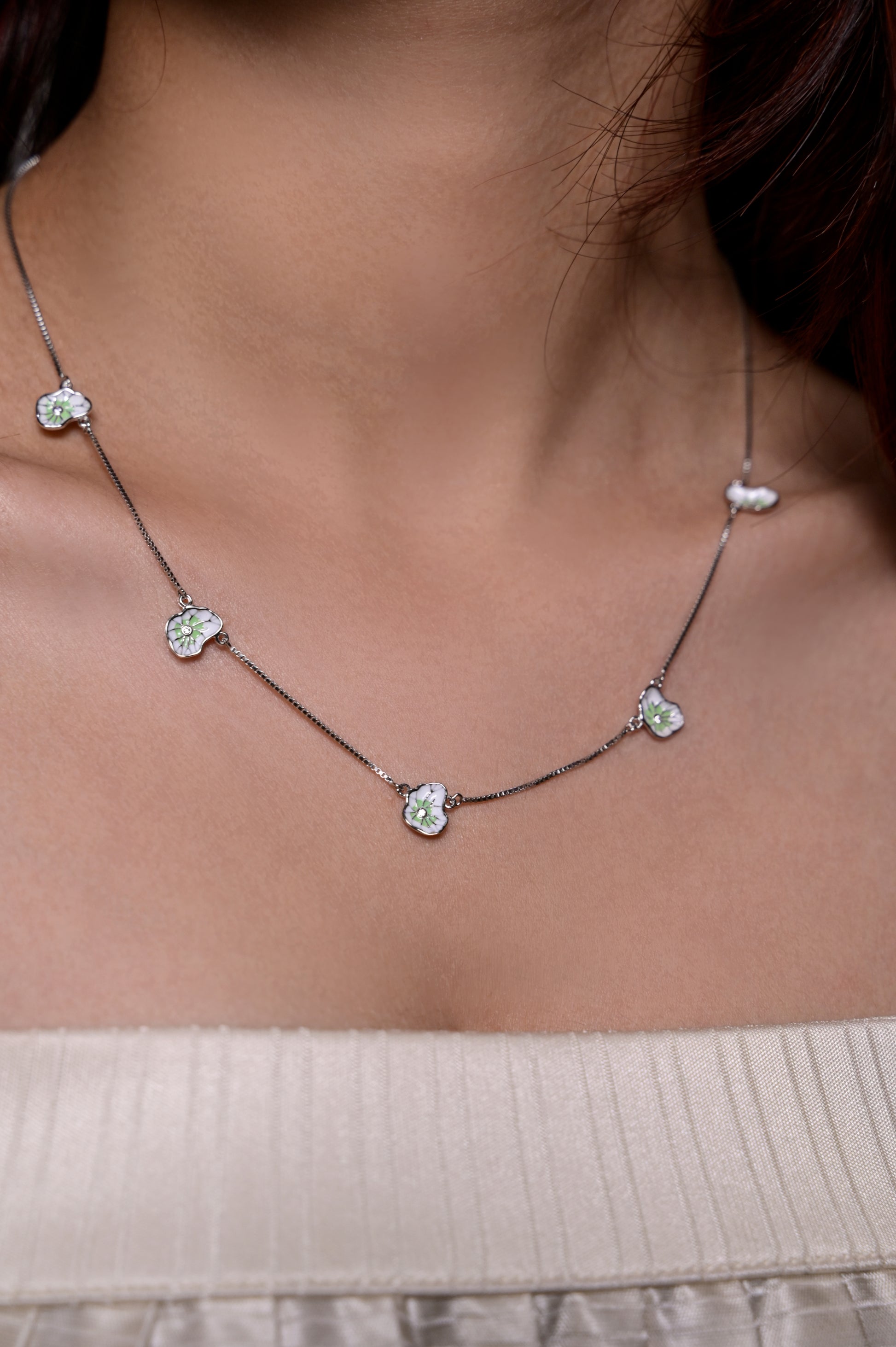 Delicate, graceful, and beautifully feminine — the Blooming Petals Enamel Necklace is a soft statement piece designed to elevate everyday elegance. Featuring a series of dainty floral motifs, each petal is hand-enamelled in soothing white with a touch of fresh green at the centre, giving the piece a natural, serene charm.