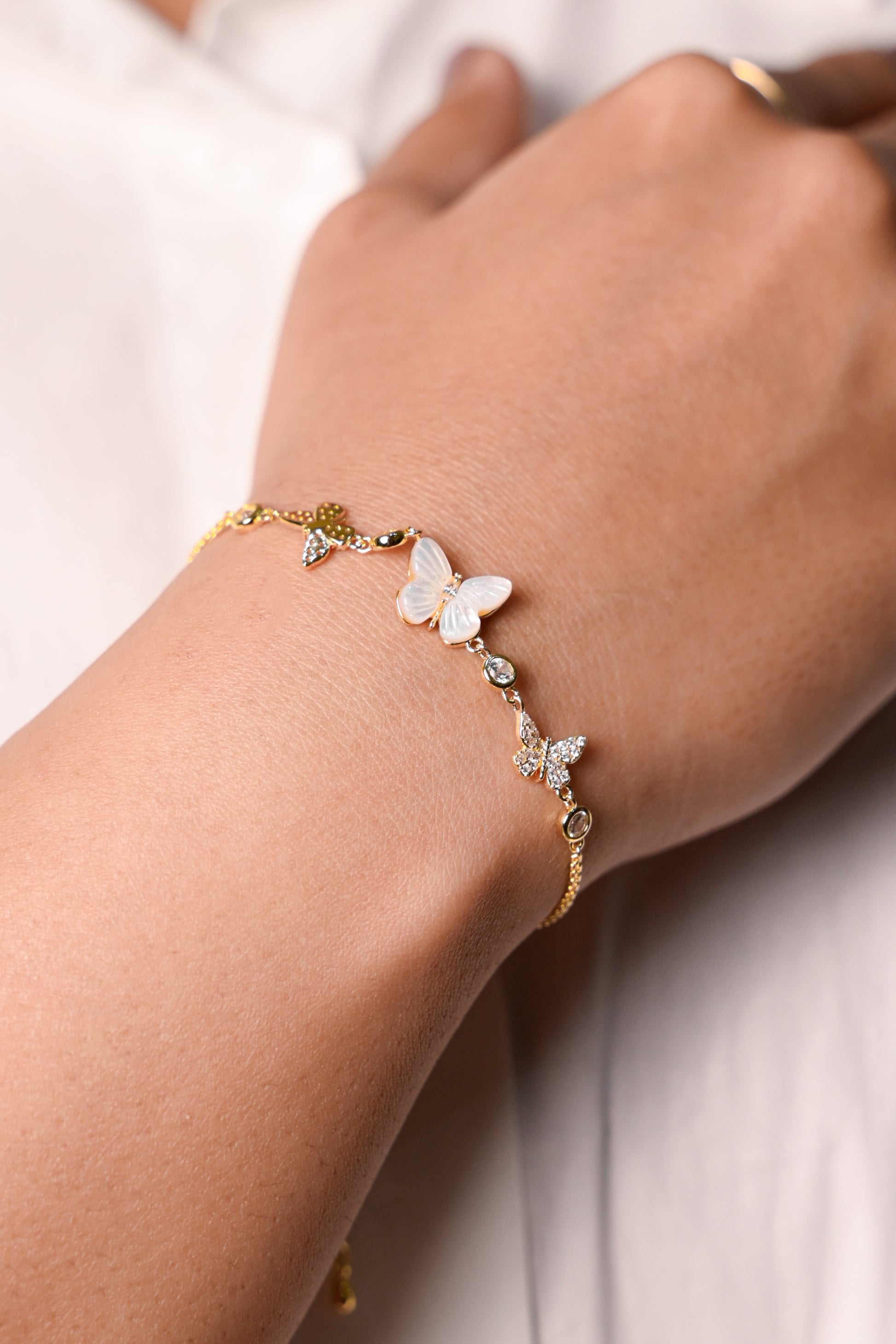 Soft, whimsical, and beautifully radiant — the Celestial Butterfly Charm Bracelet is designed to bring a touch of dreamlike elegance to your everyday style. At the centre sits a luminous mother-of-pearl butterfly, carved with delicate dimension that catches the light with every gentle movement.