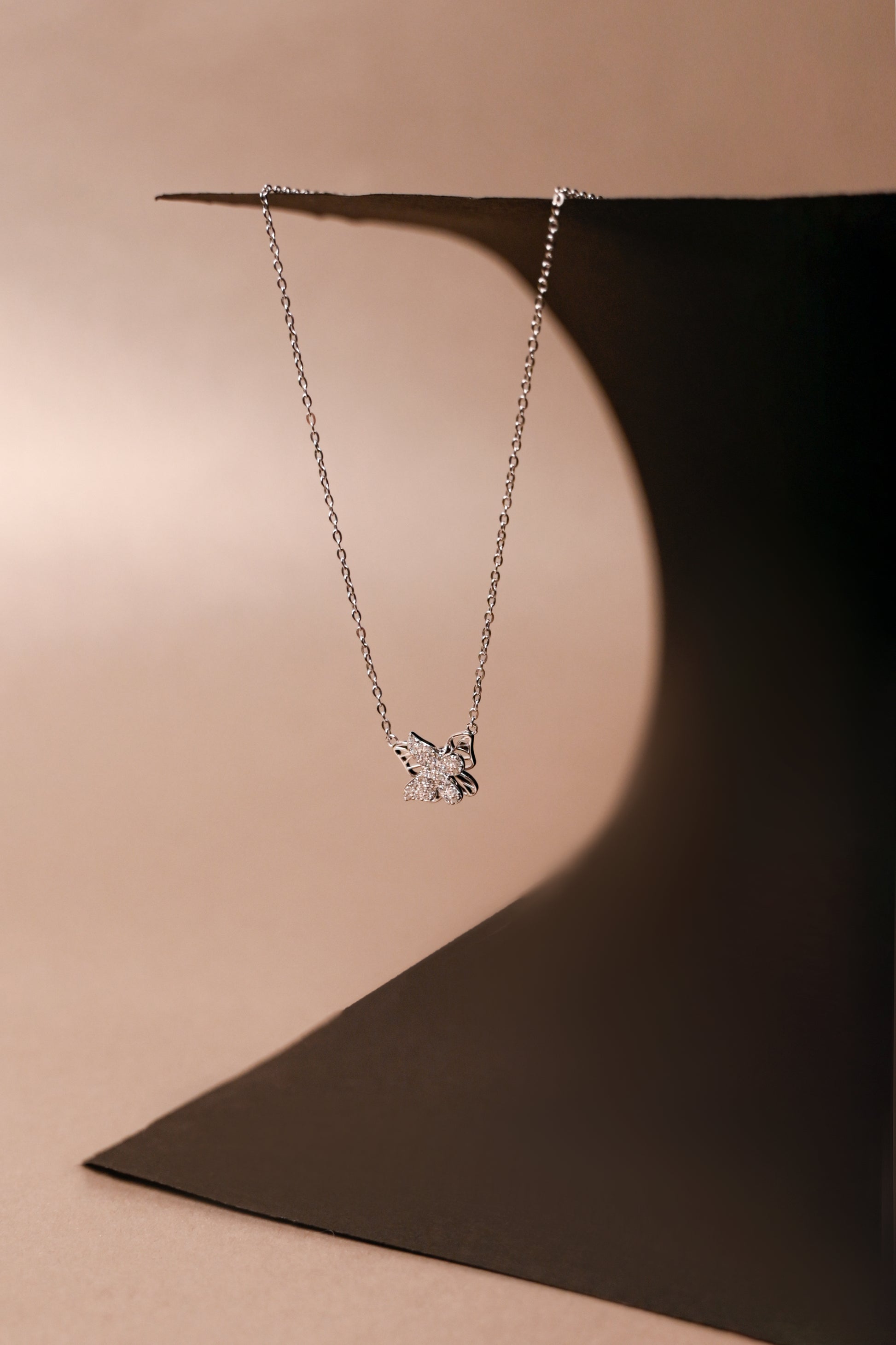 Suspended from a sleek chain, this pendant brings a touch of grace and joy to every moment. Whether worn as a symbol of transformation or simply as a charming daily adornment, it embodies effortless femininity and timeless charm.