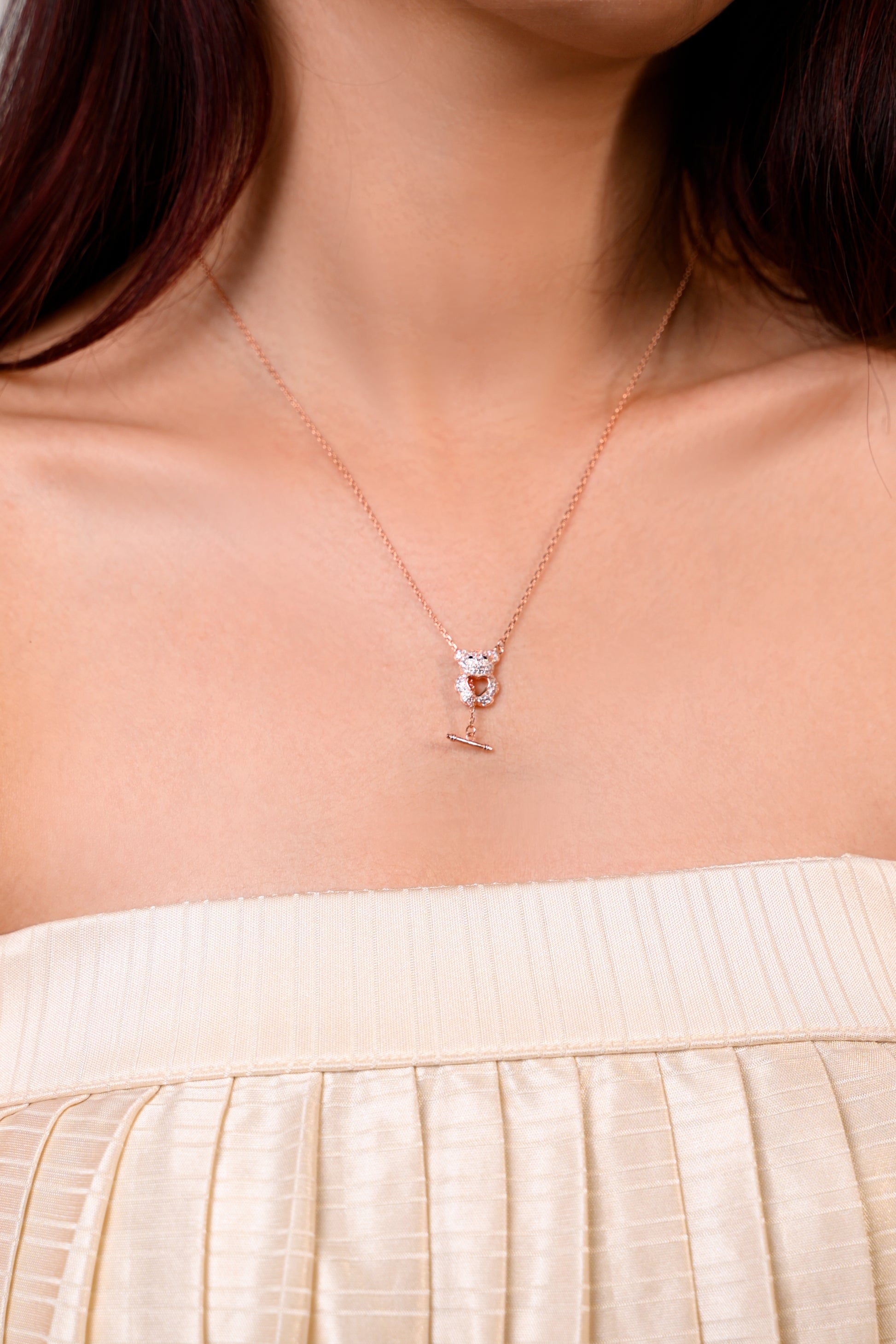 A dainty bar dangles gracefully below the bear, adding soft movement and a whimsical touch with every step. Whether worn in rose gold for a soft romantic glow or classic gold for a brighter, timeless finish, this pendant is a delightful blend of cuteness and elegance.