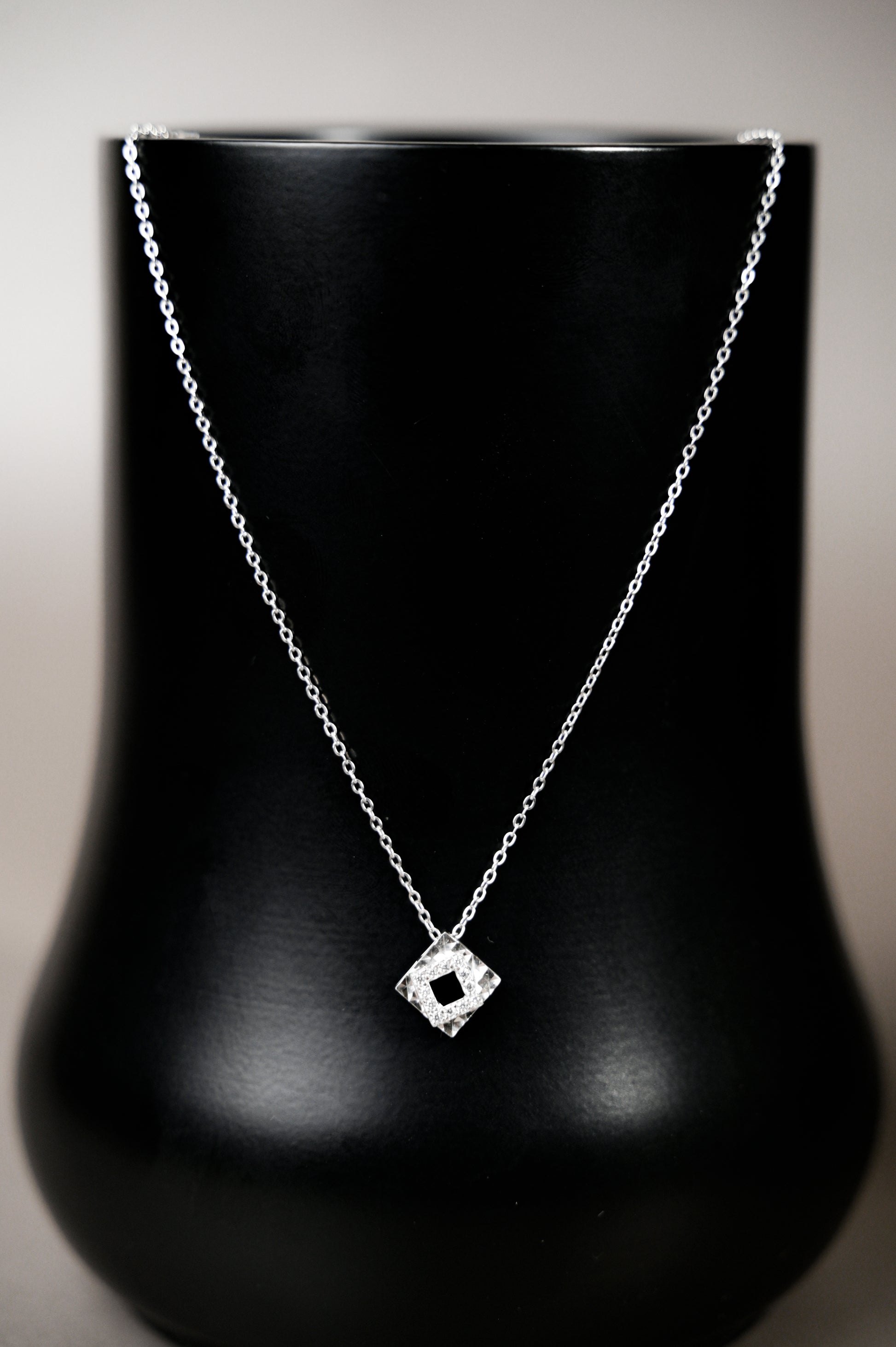 Suspended from a refined minimalist chain, the piece embodies understated sophistication — perfect for everyday elegance, yet polished enough for evening refinement. Its clean lines and luminous detailing make it a versatile essential in any jewellery wardrobe.