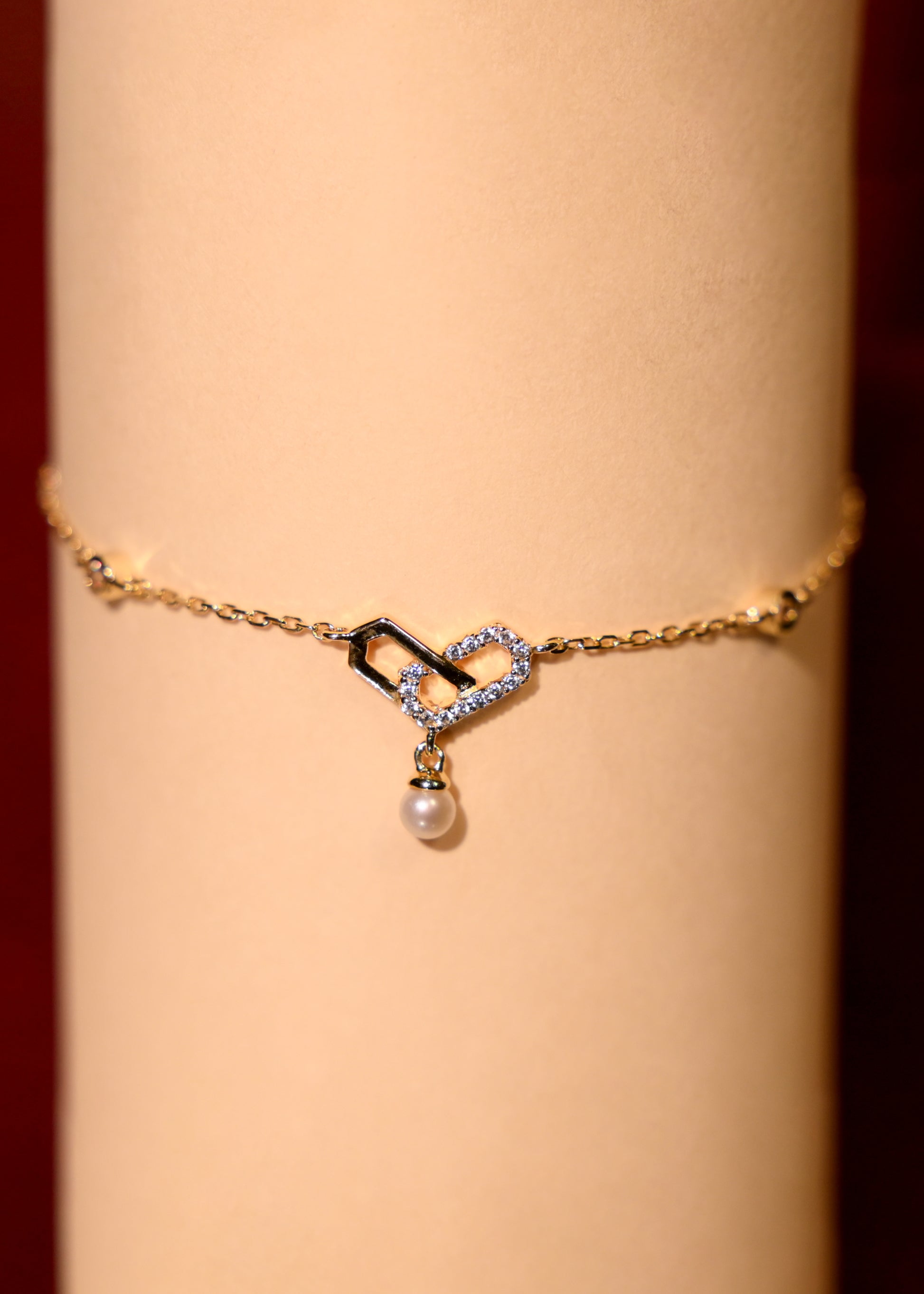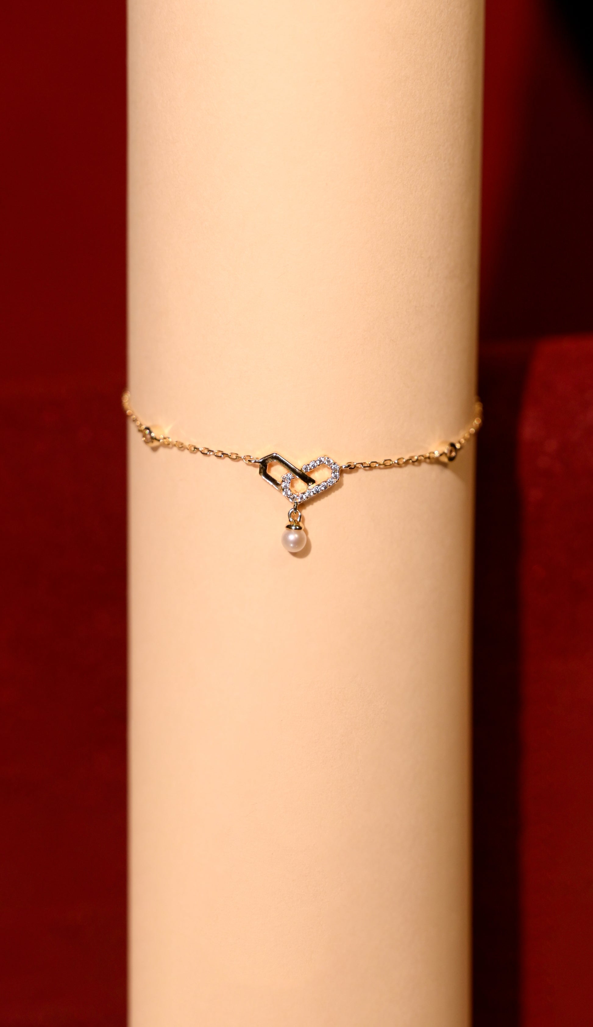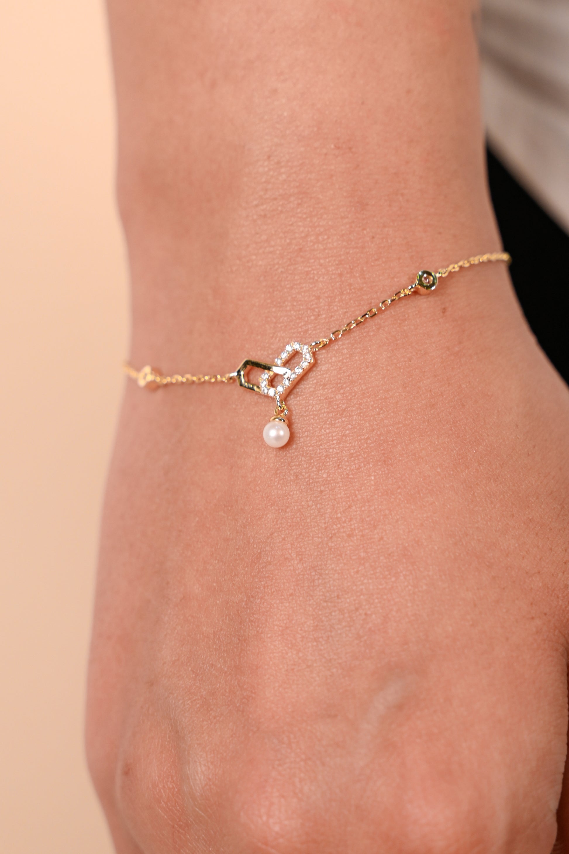 Suspended delicately beneath the motif is a luminous pearl drop, adding a touch of classic sophistication and fluid movement to the bracelet. A polished gold chain completes the design, featuring a subtle bezel-set stone along its length for an added whisper of sparkle.