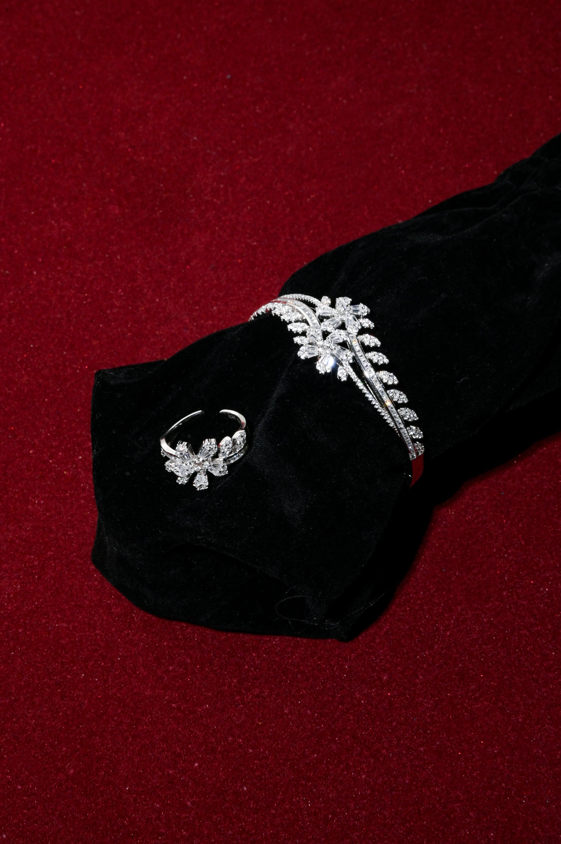 Exquisitely radiant and artistically designed, the Luxe Bloom Bracelet & Ring Duo is a statement-making set crafted for women who adore refined glamour. This coordinated pair features a stunning floral-inspired motif, brought to life through clusters of brilliant stones arranged to mimic delicate petals and graceful leaf-like forms.