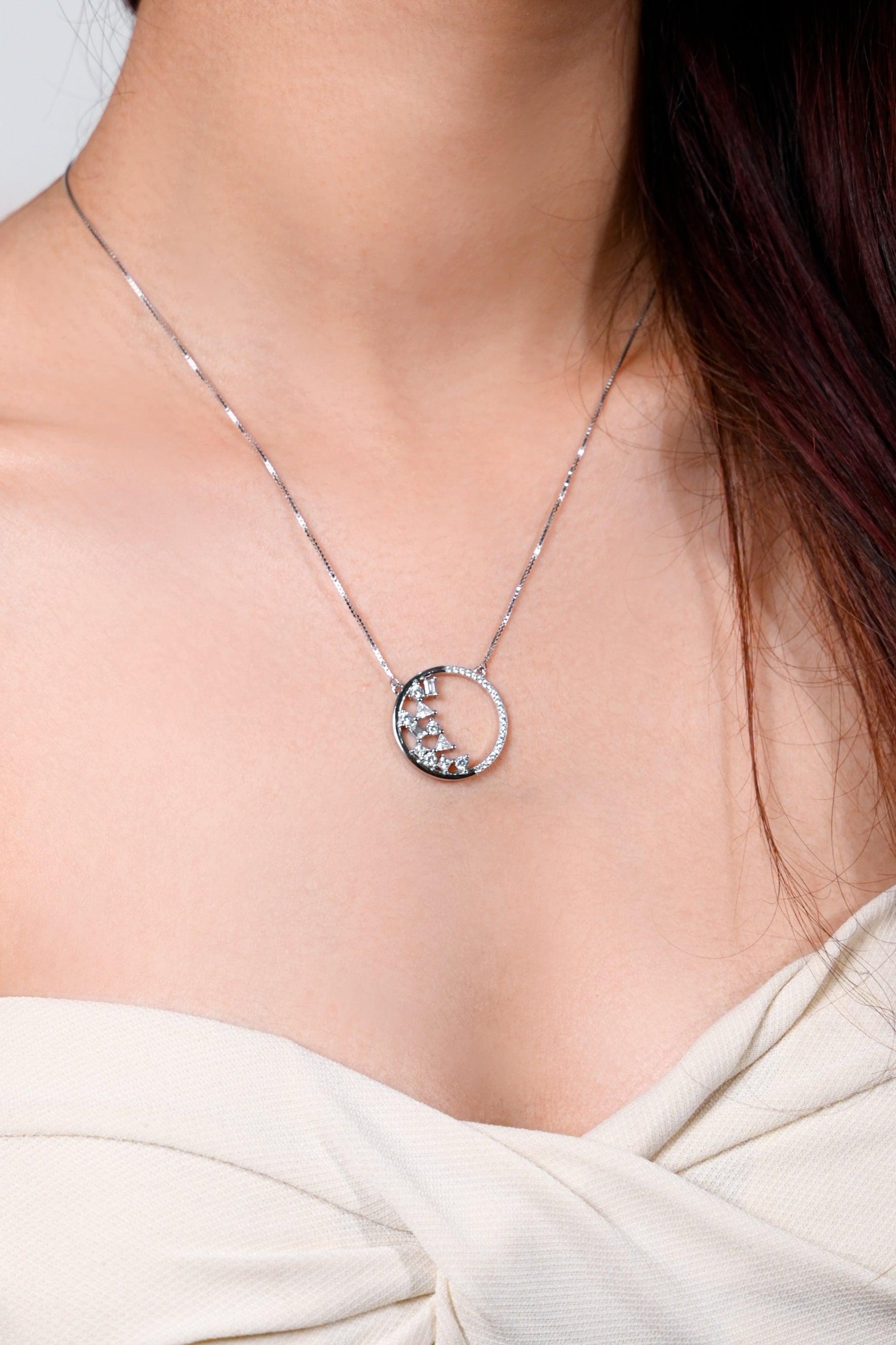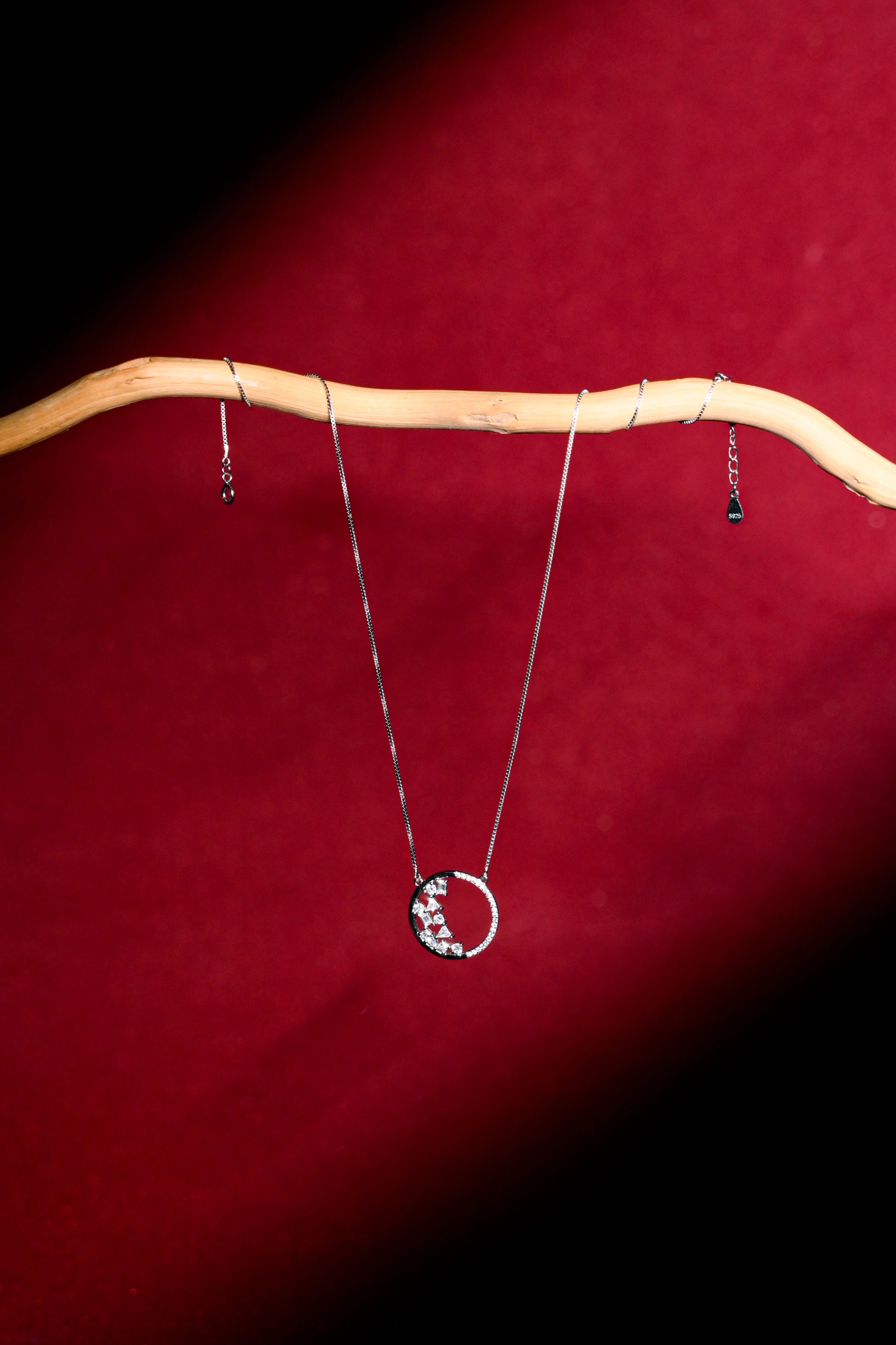 Graceful, modern, and dreamlike — the Moonlit Cascade Pendant captures the magic of a quiet night sky. A sleek open circle forms the perfect frame for a sparkling cascade of geometric stones, arranged like falling stars drifting across a crescent-lit horizon.
