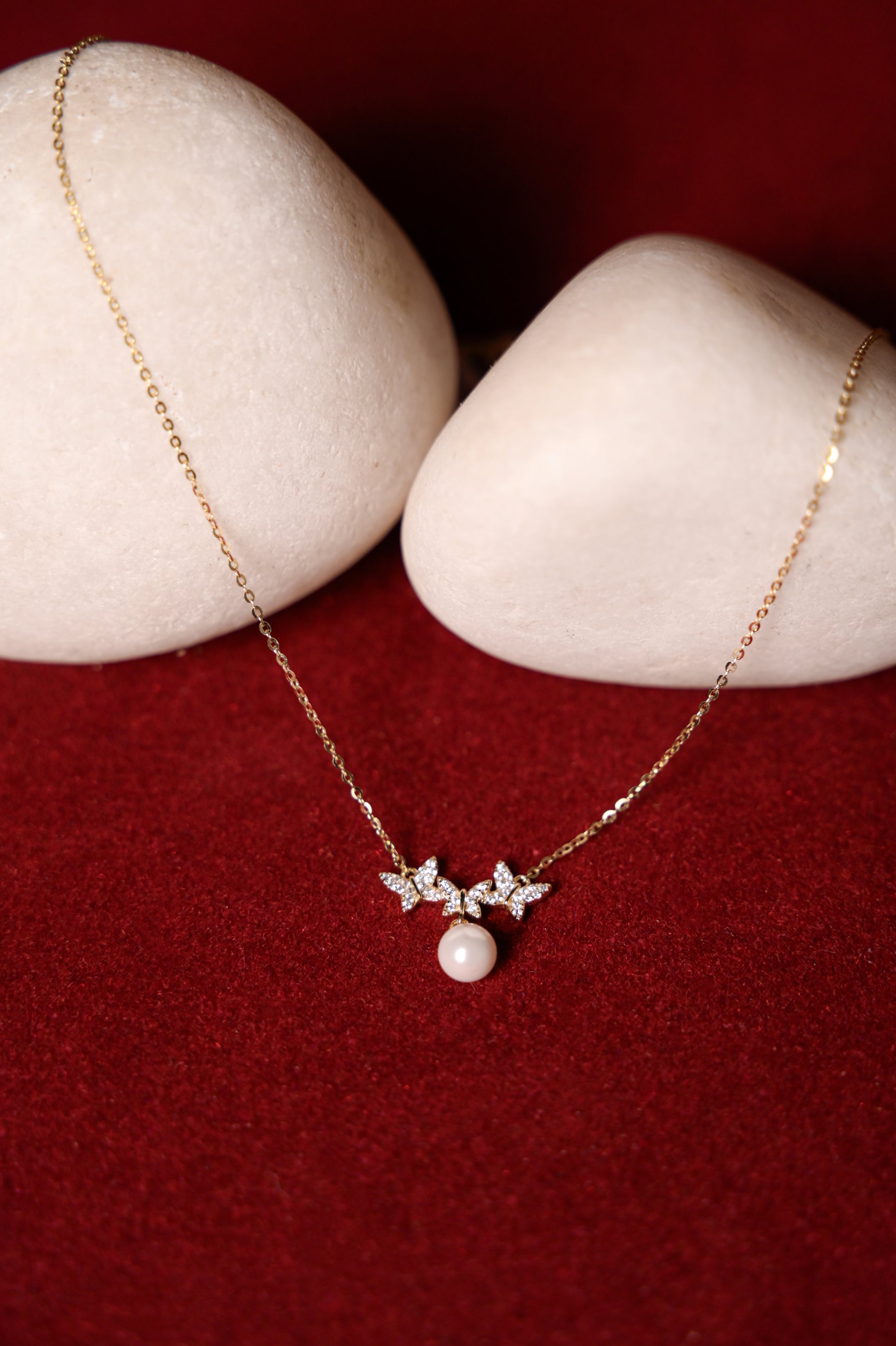 Suspended beneath them is a luminous pearl drop — a soft, elegant contrast that adds timeless femininity to the design. Available in both silver and gold chain options, this pendant effortlessly adapts to your personal style, making it perfect for everyday elegance or special evenings.