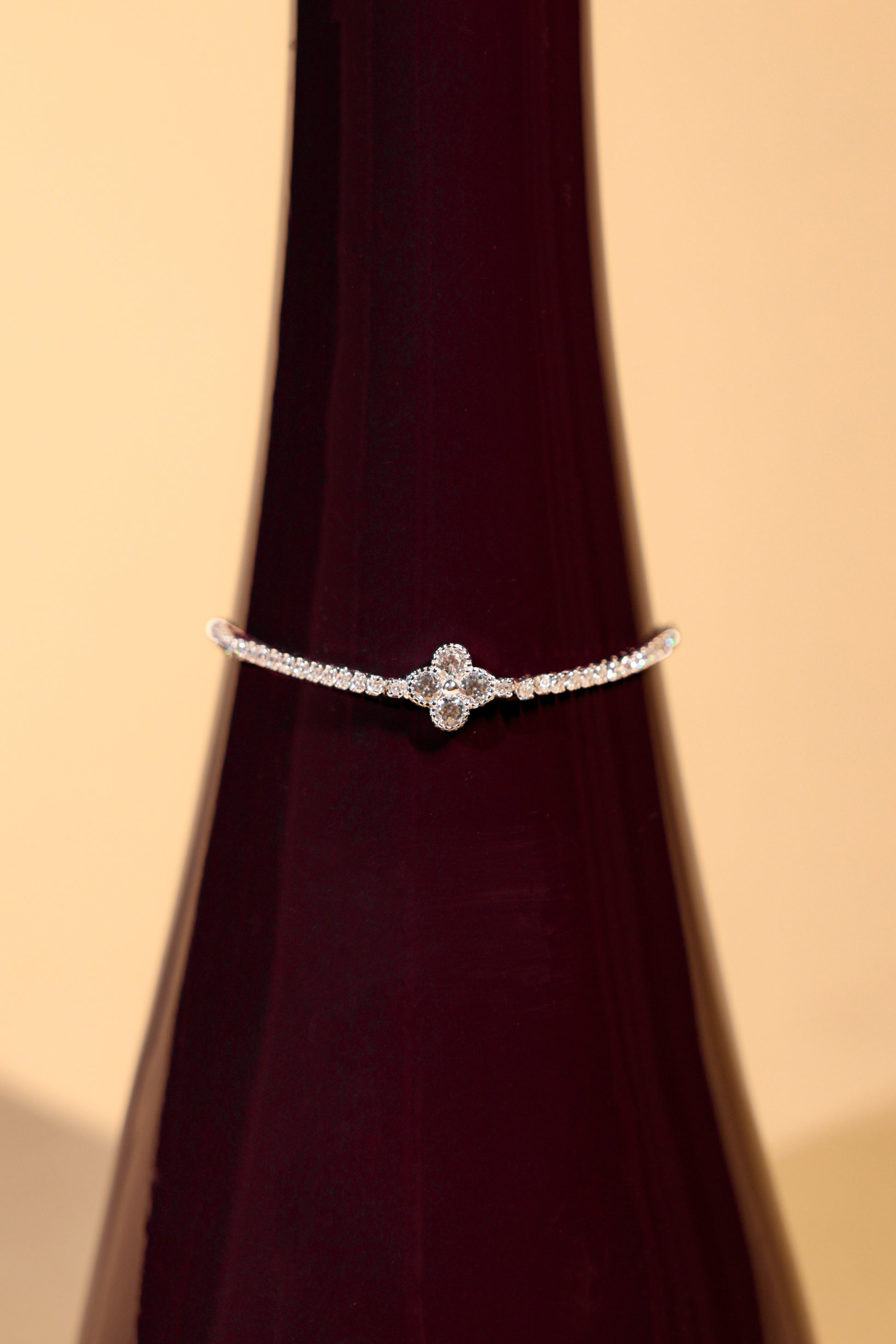 The centrepiece, crafted with precision-set pavé stones, forms a soft floral-inspired cluster that adds just the right touch of charm and brilliance. Lightweight and comfortable, this bracelet is ideal for daily elegance yet polished enough to elevate evening looks.