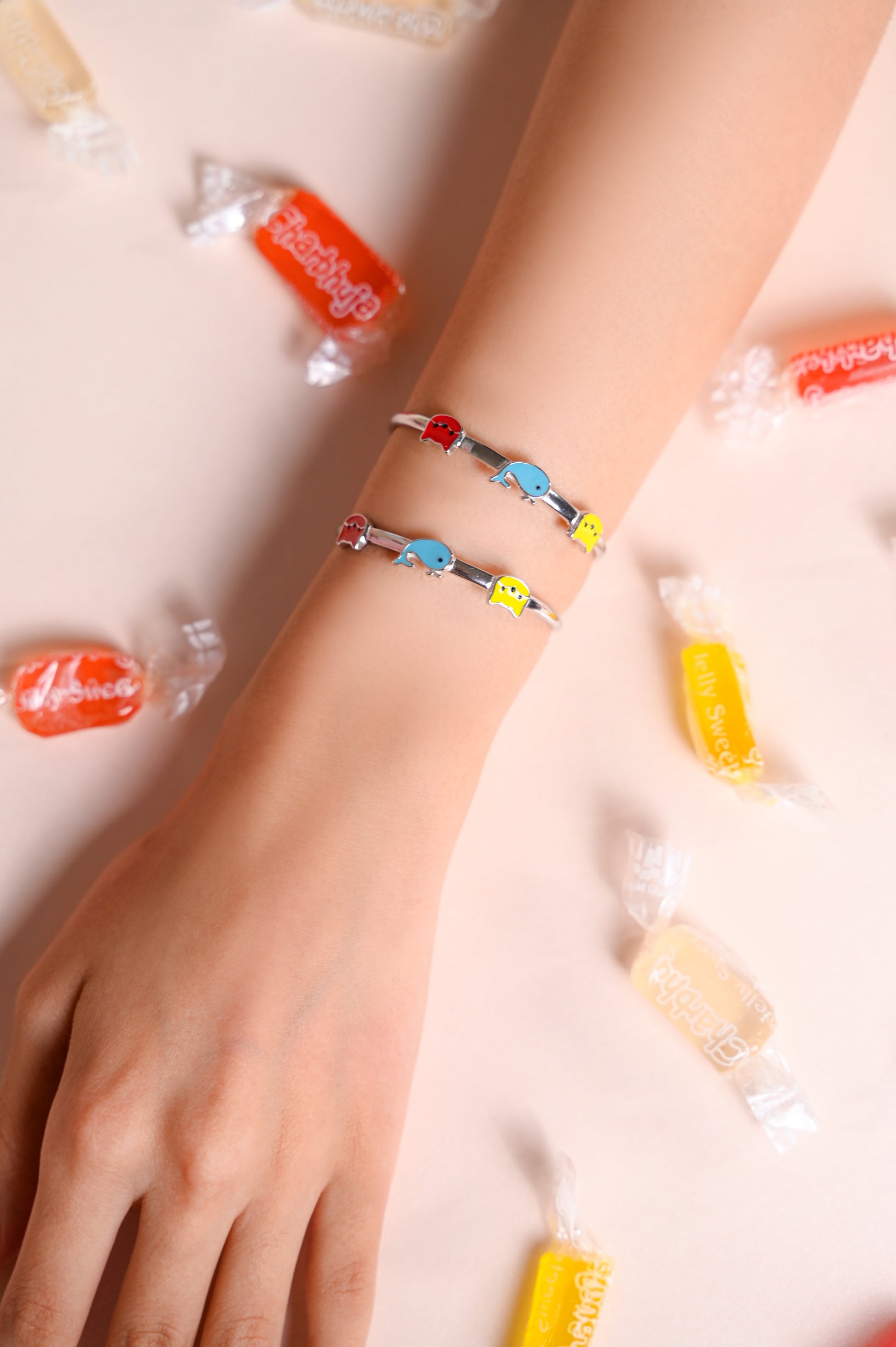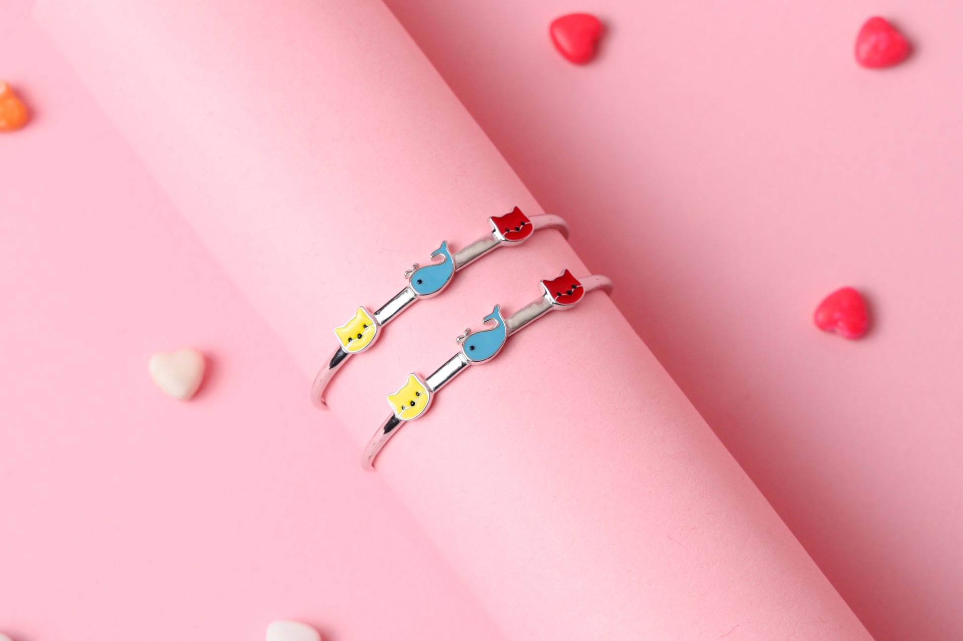 Sweet, colourful, and full of cheerful charm — the Whale & Kitty Friends Bangle is designed to brighten up your little one’s everyday adventures. Featuring an adorable trio of enamel characters — a smiling blue whale, a sunny yellow kitten, and a playful red kitty — this bangle brings a delightful splash of personality to any outfit.